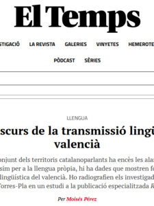 Les dades sobre l’ús del valencià tenen un reflex en les dades sobre la transmissió lingüística del valencià, tal com explica l’article «Els clarobscurs de la transmissió lingüística delvalencià» de Moisés Péres (El Temps, 13.12.2025), derivat de la lectura. L’article resumix destaca dos elements: