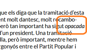 1. [N1 V N2] (N1[material, reflex]; N2[superfície, lloc]) [Un material, un reflex]1 fer esdevenir opac1 [una superfície, un lloc]2. Los reflexos que ‘ls moviments de D. Pau promogueren en los vidres, que la claror de fòra opacava, l’atragueren més y més […]. [Oller (1885): N, p. 377]i.2. [N1 V N2] (N1[fet, situació]; N2[veu]) [Un fet, una situació]1 fer esdevenir mat3 [la veu]2. Mentre enraona, pensa el partit que ell trauria d’una situació com aquella, i el marriment li va opacant la veu. [Calders (1955): N, p. 24]i.3. [N1 V N2] (N1[humà, fet, causa]; N2[situació, vida]) [Algú, un fet, una causa]1 fer esdevenir menys vistosa [una situació, la vida d’algú]2. Si el qui pagava estava content, i els espectadors sentien admiració, poques coses podien opacar l’èxit del guardaagulles. [Calders (1957): N, p. 82]i.